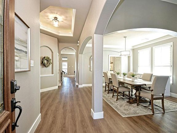 Warm fireplaceKitchen barVaulted ceilingTray ceilingFenced backyardCrown moldingWelcoming porch