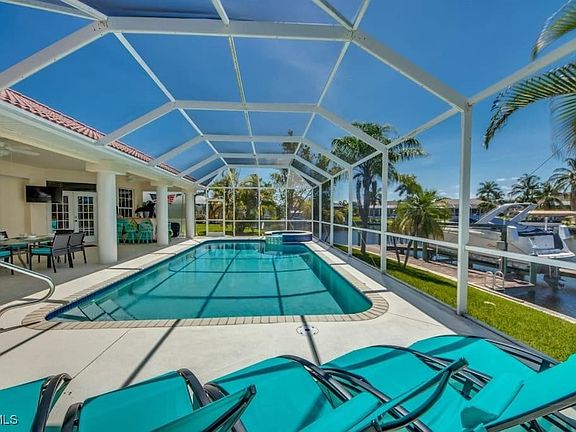 Welcome to Villa Sunshine, a beautifully maintained turnkey home located in one of Cape Coral’s most desirable neighborhoods. This light-filled 3-bedroom, 2-bath residence offers immediate move-in convenience and an exceptional lifestyle on a quiet saltwater canal with a short and easy ride to open water. A private boat dock with a 10,000-lb lift provides direct access for boating enthusiasts, making this property ideal for enjoying the Gulf waters at any time. Enjoy Florida living at its finest with a stunning oversized pool and electric-heated spa, all set within a spacious screened lanai that provides generous lounging and entertainment areas. Inside, the home features a bright kitchen with white cabinetry, granite countertops, and an inviting dining space overlooking the water. Tile flooring flows through the living and dining areas for effortless maintenance, while all bedrooms offer warm laminate flooring. The primary suite includes a modern walk-in shower and double sinks. This home has been very well cared for and also offers an excellent rental history with strong income potential, making it an outstanding opportunity for both homeowners and investors. Its availability is limited due to seasonal bookings, underscoring the high demand in this sought-after location close to shopping, dining, and Cape Harbour. Turnkey and ready for its new owners, this property combines comfort, style, and a premier waterfront setting—ideal for enjoying the Southwest Florida lifestyle year-round.