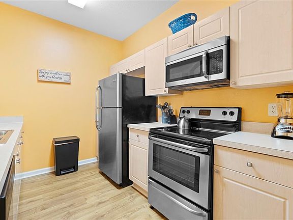 Don’t miss this rare first floor condo in the sought-after Windsor Palms Resort! Step inside and enjoy a bright, open layout featuring a combined living and dining area that flows seamlessly to a screened patio, perfect for relaxing after a day at the parks. The split bedroom design offers privacy and comfort. On one side, you’ll find a spacious primary suite with a walk-in closet and private bath. The opposite side includes a large second bedroom and a generous third bedroom, which share a full bath. All bedrooms and the main living areas feature new LVP flooring. This condo comes fully furnished and move-in ready, complete with stainless steel appliances, washer and dryer, and everything needed for a fantastic vacation rental or personal retreat. A newer AC unit provides peace of mind. Windsor Palms is a gated resort community with 24-hour security and a long list of amenities: a resort style pool, hot tub, splash pad, fitness center, clubhouse with arcade and movie theater, tennis, basketball, playground, Tiki bar, and more. Perfectly located just minutes from Disney, golf, restaurants, shopping, and entertainment, this condo is zoned for short-term, long-term, or full-time living. Opportunities for ground floor units like this are few and far between, schedule your showing today!