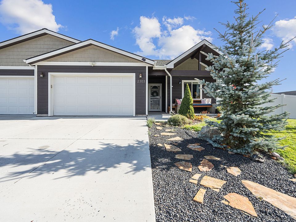 Set on a corner lot in Southside Estates near Rankin Elementary and Lone Pine State Park, this single-level townhome delivers low-maintenance living in a peaceful South Kalispell neighborhood. The open layout connects the kitchen, dining, and living areas beneath vaulted ceilings, creating an airy and welcoming space. The kitchen features generous counter space, stainless-steel appliances, and an eat-up bar ideal for casual dining. The primary suite offers a private bath with a step-in shower, while two additional bedrooms and a full guest bath provide flexibility for guests or a home office. Enjoy a landscaped yard with underground sprinklers, a covered porch, and a back patio perfect for relaxing or entertaining. An attached oversized single garage and paved driveway add convenience, while a heat pump ensures year-round comfort—all just minutes from shopping, downtown Kalispell, and the Highway 93 Bypass.