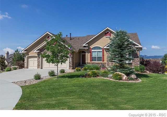 See the 3D Tour! Nestled on a cul-de-sac in the highly desirable, and prestigious Flying Horse community, sits this beautiful ranch home on a private .46acre lot, w/low maintenance stone & stucco exterior. Upon arrival, your eye will be drawn to the mountain views that compliment this stunning home. Tiled floors greet you upon entry, leading to gleaming hardwood floors & dramatic 10' ceilings. Step through the elegant archways to the formal dining room, featuring crown molding.. The dining rm is just steps away from the