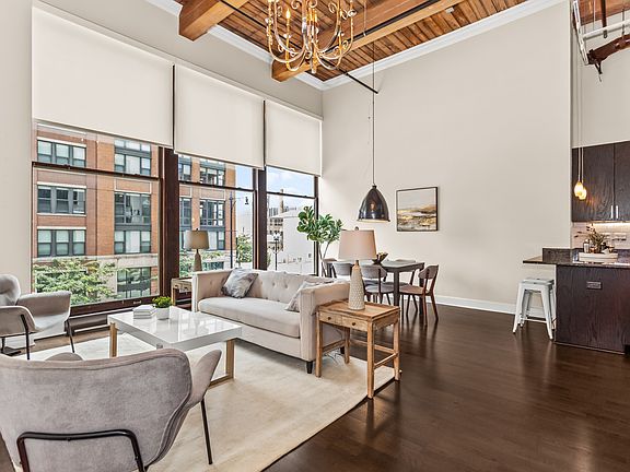 HOT, RARELY AVAILABLE MOTOR ROW LOFTS! Live in style at this standout loft in the original Cadillac building in the South Loop! This 1-bedroom + den unit combines historic charm with smart modern upgrades-featuring soaring 16' timber ceilings and a flexible, open layout. A spacious foyer with generous closet space welcomes you into the unit. The kitchen is equipped with granite countertops, high-end stainless steel appliances (including a premium microwave), bar seating, dark modern cabinetry, and crisp white subway tile. Track lighting was updated in 2020, and the kitchen and den received a fresh refresh in July 2025. The open-concept living/dining area is bathed in natural light from floor-to-ceiling windows, complete with custom battery-powered blinds (installed in 2022). The living room features a cozy fireplace, custom built-ins with bar area, and three 14' functional windows-no screens, for a clean, uninterrupted view. The spacious primary bedroom includes a large walk-in closet and a full wall of built-ins. The bathroom offers glass shower doors and a tub/shower combo. The den is perfect for a home office or guest space. Additional upgrades include: Brand new In-Unit front-loading washer & dryer (2025), tucked behind a charming sliding farmhouse door for style and space-saving. HVAC replaced in December 2023, with a 5-year transferrable warranty. Entire unit painted in 2023 for a fresh, modern look. Enjoy city views from the rooftop deck. Premium first-floor deeded parking space (additional $25,000) in the attached heated garage. You'll also have tall cage storage, access to a bike room, and extra building storage. Investor-friendly and pet-friendly, with no rental restrictions. HOA includes: water, garbage, internet, cable, garage and elevator maintenance. Located just two blocks from the Green Line and minutes from downtown, lakefront paths, coffee shops, breweries, and expressways-this is a rare gem you don't want to miss!