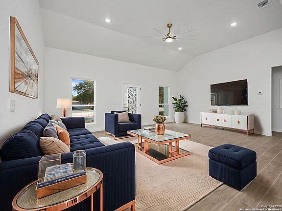 New construction custom home in Elmendorf! This beautiful 1-story features 4 bedrooms, 2.5 baths, and 2,141 sq. ft. of living space on a .48-acre lot. Enjoy an open floor plan with high vaulted ceilings, custom finishes, and walk-in showers. The home is pre-plumbed for a water heater and includes a covered back patio plus a shed with electrical-perfect for storage or a workshop. Experience country living with no HOA and with convenient access to highway 37. Quality craftsmanship and modern design throughout!