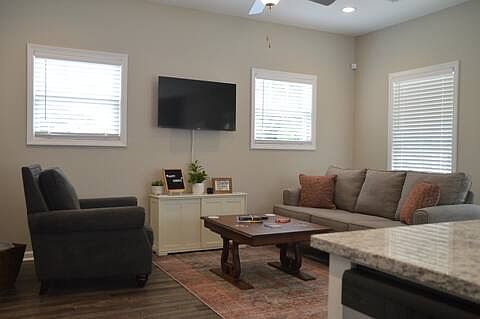 It has an open living, dining and kitchen area and granite countertops throughout.