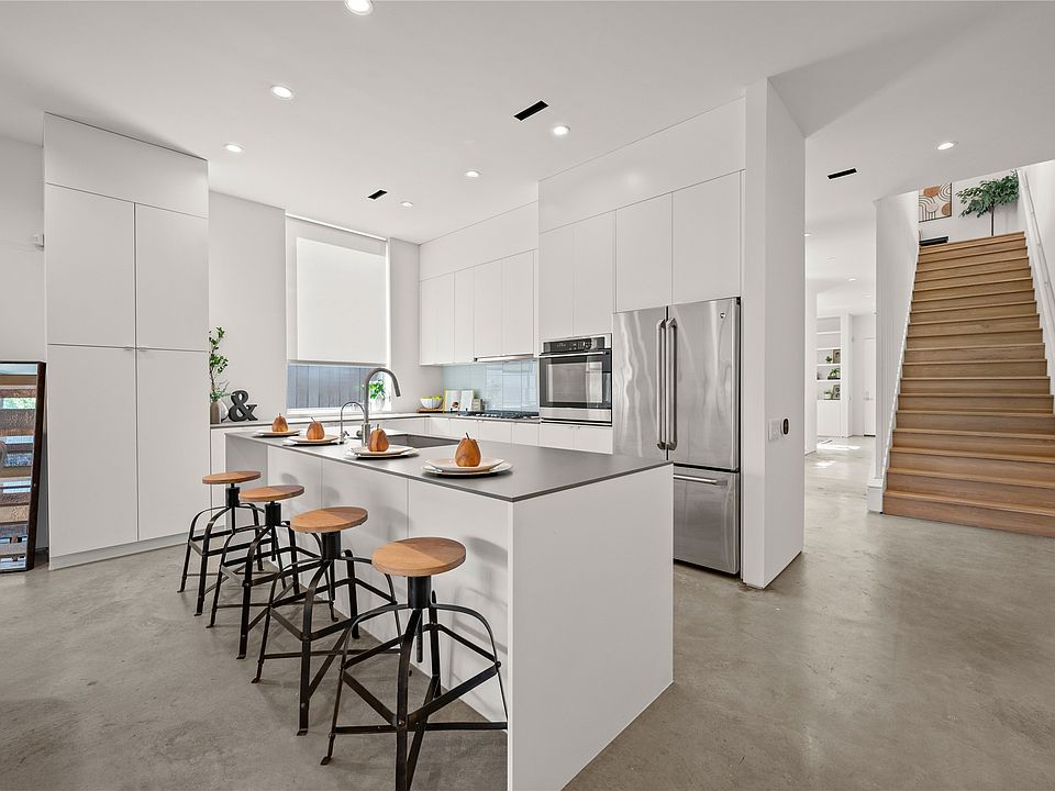 This urban single-family attached home, thoughtfully developed by award winner Alan Kagan, offers a modern blend of style and functionality. Located in a highly desirable area, this modern home is just minutes from Downtown Dallas, Lower Greenville, and Knox-Henderson. Ideally located near upscale restaurants and trendy eateries, this home is just minutes from the heart of Dallas. This residence features expansive commercial-grade windows that fill the home with natural light, creating a bright and airy living experience. Featuring paid-off Solar Panels and a level 2 240V 40A EV charger, combining sustainability with modern comfort and best of all, there’s no HOA! The main level features polished concrete flooring and an open concept layout. Immaculate high-end finishes include museum level 5 finish walls and flush doors throughout adding a refined, contemporary touch. While the elegant wood floors lead you upstairs to the private living quarters. The spacious primary suite boasts a spa like ensuite bathroom with a luxurious shower and a generous walk-in closet. A versatile office space with a full bathroom offers flexibility and can easily serve as a guest room. This private gated residence welcomes you through a secure, modern front door entrance. Enjoy the landscaped outdoor area, complete with a covered patio and lush greenery which includes a peach, maple, and holly tree- a serene space perfect for relaxing and entertaining.