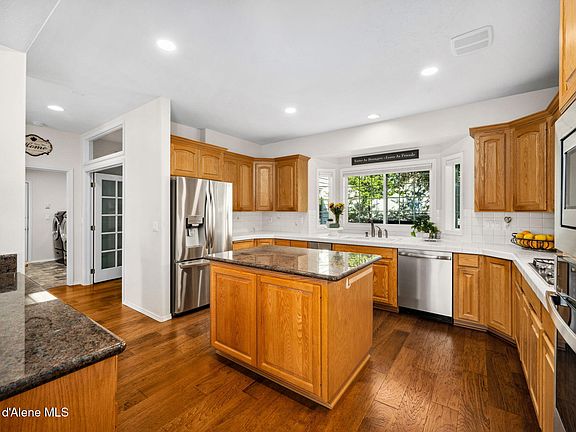Located between picturesque Hayden Lake and charming Dalton Gardens, this 4-bedroom, 3.5-bath, 3,751 sq ft home is one of the best values in the area at an incredible price! Captivating views from front decks and oversized windows pair with a huge backyard deck for entertaining. The top floor master suite and two large bedrooms are perfect for keeping the family on one level. The master retreat includes a spa-like bath, walk-in closet, and serene city views. The main floor showcases stunning luxury engineered wood flooring throughout, along with an upgraded chef's kitchen featuring new stainless appliances and a center island that flows into the formal dining room, ideal for gatherings. This level also offers a large office that could convert to another bedroom. The lower level has a versatile game room with full bath and separate entrance, perfect for multi-generational living. Completing the home is a spacious 3-car heated garage. Additional features include generously sized bedrooms, an office, abundant storage, and an oversized 3-car garage with a 10-foot door, accommodating small RV or boat parking