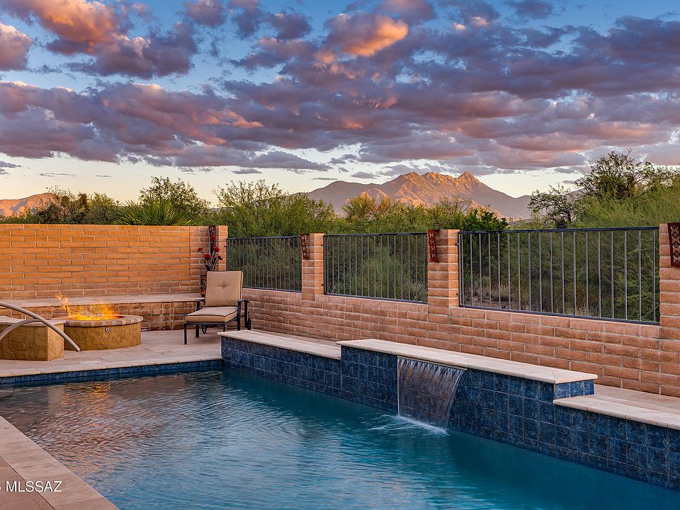 This spectacular home on sought-after Madera Plateau in Quail Creek resort community borders lush, desert arroyo and offers stunning views of the Santa Rita Mountains. You'll enjoy outdoor living at its finest with a refreshing pebble sheen pool and spa surrounded by travertine pavers, outdoor kitchen, fire pit and extended covered patios. This popular Sonata model has 4 BR Suites (including the casita, all with en suite baths) plus a Den and powder room. Gorgeous curb appeal w/ gated front courtyard, and glass paneled entry door. Foyer leads to the great room, anchored by gas fireplace and soaring 12' ceiling. Kitchen has a grand island w/ granite counters, upgraded cabinets, stainless appliances, and 36'' gas cooktop. Full wet bar off the dining area with storage and beverage coolers. Spacious owner's Suite has box bay window and exit to rear patio. The main bath has dual vanity, all-tile shower, and huge walk-in closet w/ custom built-ins and doors at both ends, offering easy access to the laundry. Bedroom 2 in the main house has an en suite bath w/ tub/shower combo. Bedroom 3 has built-in wall unit, for use as an option second office, and includes an attached full bath w/ tile shower. Plus there's a separate Den off the foyer, separate powder room, and laundry with added storage. Step out to the front courtyard to the private entry Casita, where overnight guests will enjoy luxury accommodations, complete with a kitchenette and full en-suite bath and tile shower. Back outside, the outdoor living space is a sanctuary of its own, with jaw dropping mountain views, awe-inspiring sunsets and pristine desert surroundings. Rear patio includes electronic shades. Extended length garage with golf cart bay and side service door. This home is the unicorn you've been waiting for!