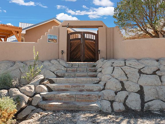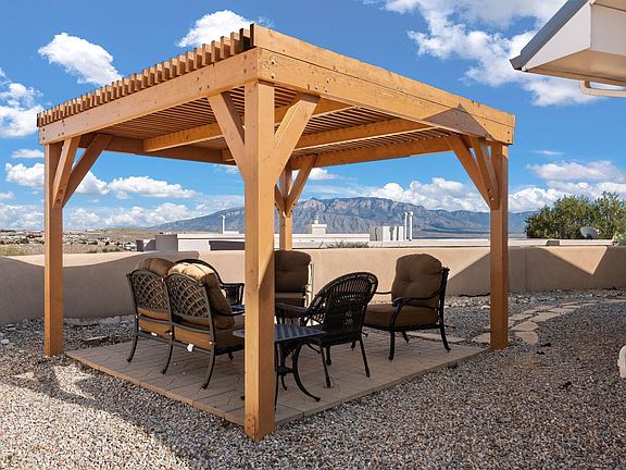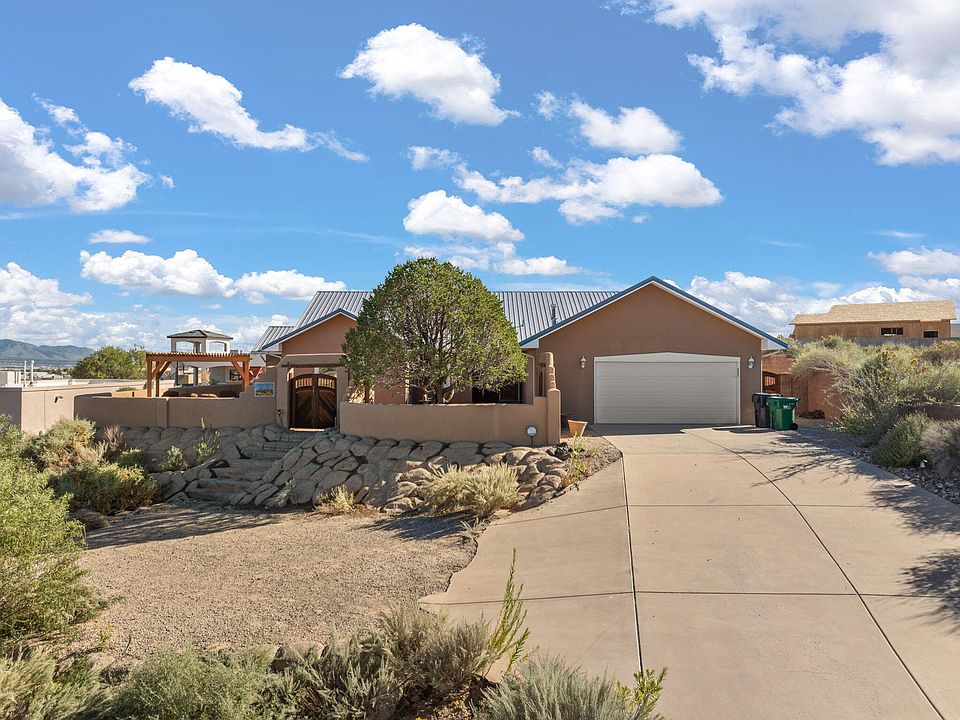 Beautiful One-Story Custom Home w/ Mountain Views! This 3bd, 2ba home sits on 0.51 acre w/ stunning Sandia views. Features include: metal roof, Pella doors, brand-new 2025 carpet, and a 6-year-old septic system. A welcoming courtyard opens to a family room with a wood burning kiva fireplace w/a gas starter and a spacious eat-in kitchen w/ granite counters and ample cabinetry. The primary suite offers a walk-in closet and private bath, while two additional bedrooms share a full bath. Both the family room and primary bedroom connect to a covered patio, perfect for indoor-outdoor living.