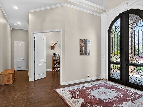 Exquisite 4-bed home, with ensuite baths & walk-in closets, showcasing rich hardwood floors, soaring ceilings, and custom built-ins framing a cozy gas fireplace. Gourmet kitchen boasts double islands, granite counters, wine fridge, & endless cabinetry, opening to elegant dining and living spaces. Designer colors, chic fixtures, and abundant windows fill the home with light. Enjoy a private backyard oasis with pool/spa, half-bath access, and lush green space. Includes office (w/closet!), media room w/projector/theater chairs, and 4-car garage on quiet cul-de-sac.