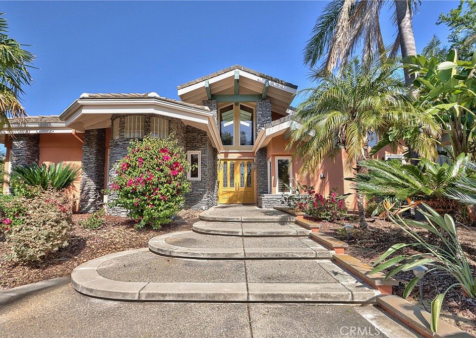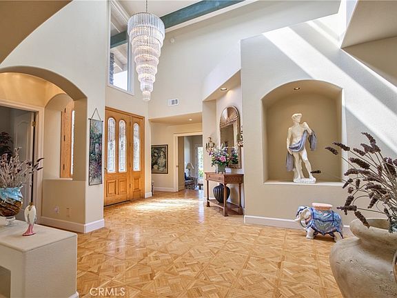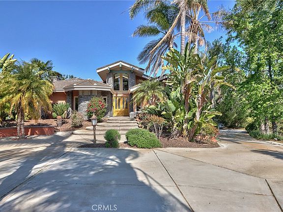 Perched above 13+ acres of rolling hills with panoramic views and a flourishing orchard of 1,200± Hass avocado trees, this custom-built, single-level contemporary estate is the ultimate blend of elegance, comfort, and privacy—just minutes from Old Town Temecula, wineries, and upscale dining. Gated for privacy, the home welcomes you with a light-drenched open floor plan, three oversized bedrooms, a den, and exquisite architectural details throughout. The gourmet kitchen is a true centerpiece, featuring granite countertops, a coffered ceiling, a large central island with abundant storage, a breakfast nook, and a full butler’s pantry with a private door and stairway that leads directly down to the garage level. The living space is elevated above the garages, maximizing both views and privacy. Entertain with ease in the formal dining room with its own coffered ceiling or the expansive family room complete with a wet bar and a striking double-sided fireplace. French doors from both the kitchen and living room open onto a spacious wooden deck and large patio, seamlessly blending indoor-outdoor living. The luxurious primary suite offers a double-door entry, cozy sitting area, and a spa-like bathroom with a jetted tub and its own coffered ceiling. With one full baths, one three-quarter and two half bathrooms, a flat lawn dotted with fruit trees and roses, and a 3-car garage tucked beneath the home, this estate delivers timeless sophistication, modern comfort, and unmatched natural beauty.