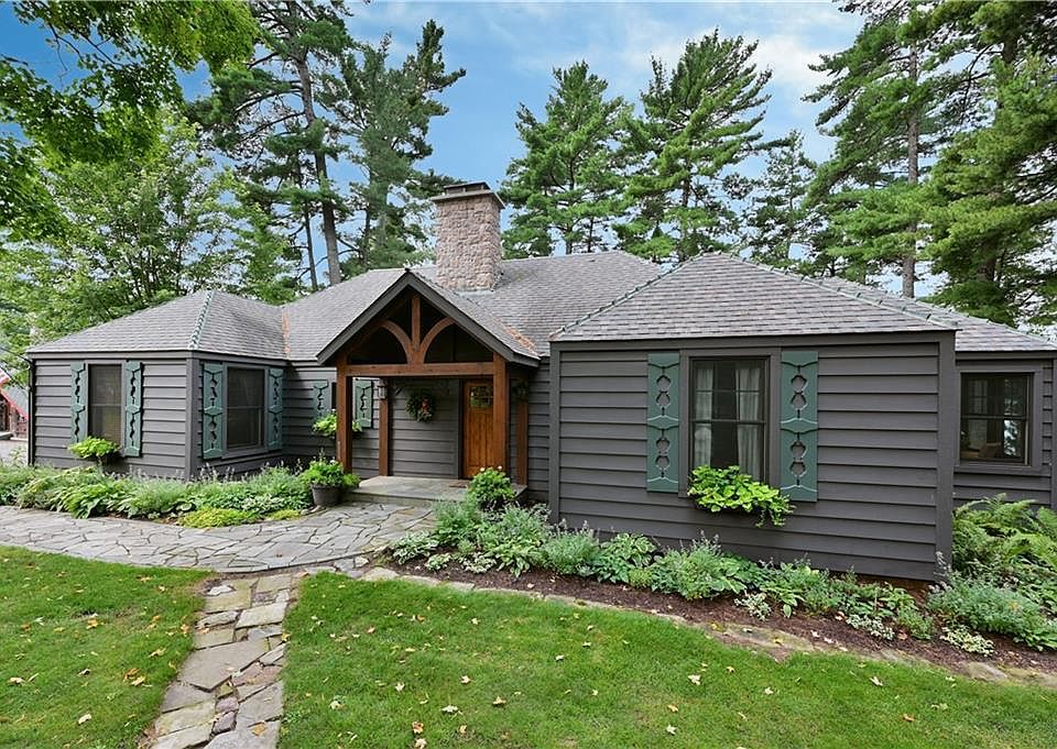 Take in the most beautiful sunset view available on Lake Namekagon from this classic 1920s resort cottage that was lovingly restored and updated in 2009 by master craftsman preserving its historic charm while infusing modern comforts. As you step inside, you'll be greeted by a warm lodge ambiance, featuring rich wood interiors and a grand stone fireplace that invites cozy evenings by the fire. The beautiful kitchen is ideal for food prep yet open to the great room ensuring the cook is party to the conversation. Just off the kitchen is an airy sunroom with lake and private side yard views. Located within the prestigious Garmisch USA Condominium, this property is thoughtfully landscaped to maximize privacy while providing access to all the community's amenities. The cottage includes a private dock for your water adventures An area is platted area for an oversized two-car garage, should you desire.