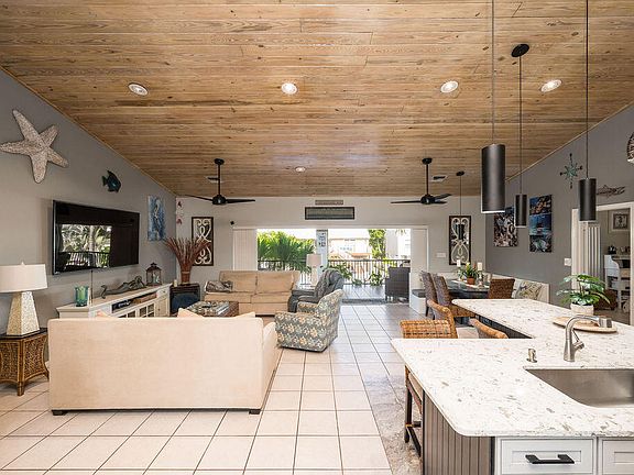 FISHERMANS PARADISE. This well-presented 3 bed, 2 bath stilted home was designed & built to be energy efficient and as maintenance free as possible. Minutes to open water (Gulf of Mexico accessed through Kemp channel & Atlantic to the south), located on a deep & wide canal, this home is designed exclusively for someone inspired to live the Florida Keys lifestyle. Upon entering, attention is drawn to the 13 ft high knotty pine tongue & groove cathedral ceilings & the sliding glass doors that open up to a 10x52 foot screened-in porch that welcomes plenty of natural light & the fresh ocean breeze. Close attention has been given to the quality of materials used in this home: concrete block construction with a stucco finish, hip metal/coating roof, 12-inch thick concrete flooring & cross beams, & 10 inches of insulation in the attic & porch. The ground floor has a large concrete slab integrally tied to the columns, with a raised height underneath the house to allow better boat/trailer parking ability & accommodate various vehicles, watercraft, & storage needs. The underside of the home is also fully stuccoed & has a boat trailer tye down. An open-plan kitchen & dining area with plenty of stylish appeals, stainless steel appliances, upgraded cabinets, granite countertops, tile backsplash, & a massive breakfast bar, all remodeled within the last 5 years. Hunter ceiling fans, recessed lighting & all, new window coverings & plantation shutters throughout all contribute to the charm of the home. 3 light-filled bedrooms have plenty of closet space & two have glass doors that open onto the deck. For the outdoor enthusiast & fisherman, a 12,000 lb boat lift, 75 ft concrete bulkhead with numerous tie-down cleats, a covered fish cleaning station, an outdoor shower, & stuccoed concrete block storage room complete with mini-split AC, & shelving. This stunning home makes an impact from the minute you lay eyes on it & is in a class of its own.