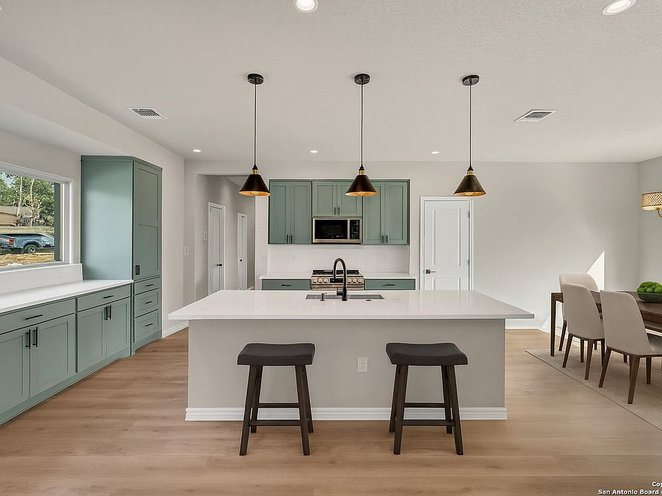 Welcome to 23048 Hilltop Peaks, located in the growing community of Sandy Oaks. Sandy Oaks is just 20 minutes from Brooks City Base and 25 minutes from downtown San Antonio. This custom home showcases a thoughtful layout with the primary suite set apart from the additional three bedrooms, creating a true sense of privacy. Step inside to soaring 12-foot ceilings, a cozy fireplace, and an open living area designed for both comfort and entertaining. The kitchen features quartz countertops, stainless steel appliances, and custom soft-close cabinetry, blending style with function. Outside, an expansive backyard offers the perfect setting for gatherings, with ample room for grilling, outdoor activities, and endless possibilities. USDA Eligible. 5.75% interest rate with our preferred lender. Down payment programs available through our preferred lender. Closing cost assistance available!