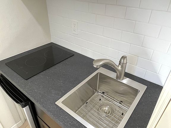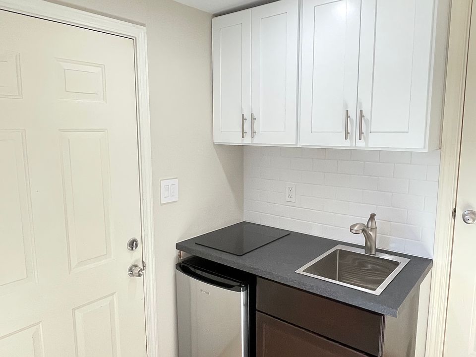 The main room measures 13'-6" x 13'. The kitchenette (in the main room) boasts brand new upper cabinets, countertop, deep stainless steel sink, faucet with spray, double induction plate and under counter refrigerator.