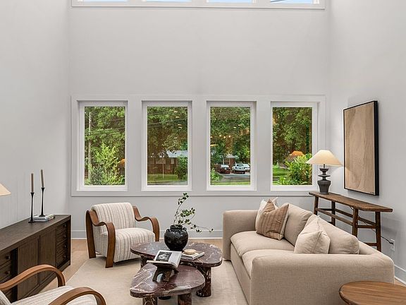 From the moment you enter, expansive windows and soaring ceilings draw you in, filling the living spaces with natural light and an open, airy feel throughout. Notable highlights include a beautifully designed kitchen featuring a wood-trimmed ceiling and upscale lighting, flowing seamlessly into the living areas. Additional touches include stylish wallpaper, organic tiles, and well-designed drop zone. Step outside to a private backyard and covered porch — perfect for relaxing or entertaining.