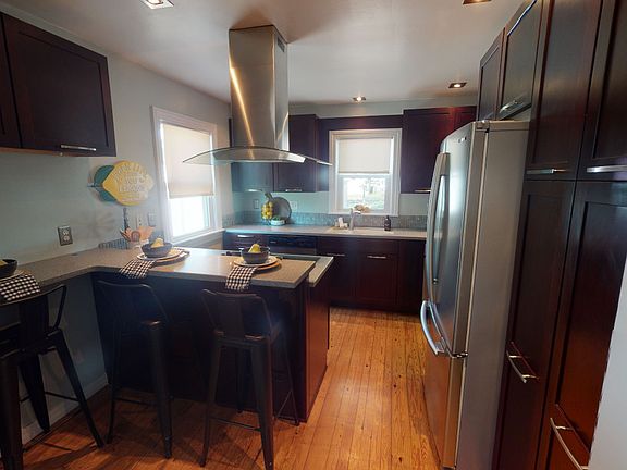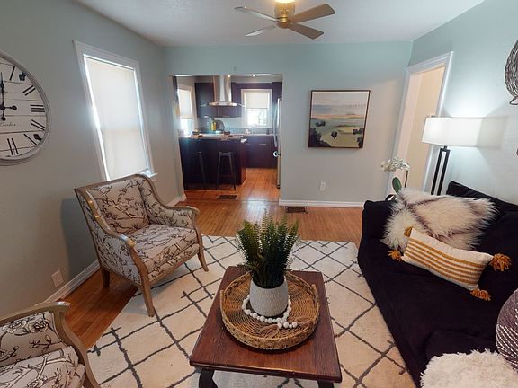The home features a beautifully designed kitchen, complete with stainless steel appliances, including a dishwasher and a built-in bar seating area. The spacious living room, which opens up to the kitchen, is perfect for entertaining guests.