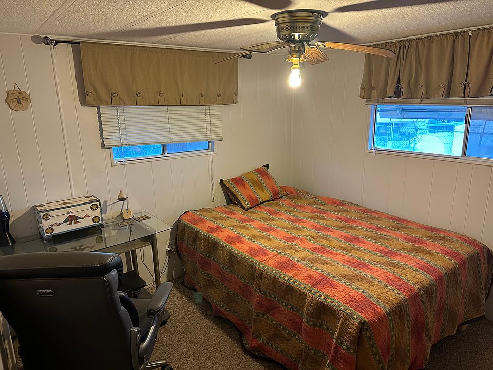 Recently Painted and cleaned furnished bedroom for rent in 55 and up community you have to be 40 and up to live here and pass a credit and background check .We are a Gated and Secure Community we have a nice Club house with Billiard room soon to have a small gym area for work out and a heated Hot Tub and Pool for all to enjoy . My place has Catalina Mountain Views from my front porch and the Tucson Mountains that face West with Breathtaking Arizona Sunsets .The Bedroom in Pics has been recently up dated with fresh paint Queen Bed with memory Foam Topper calls for a great nights sleep , have a 40 " TV with free cable w/ Remote also i have a swamp cooler keeps place nice and cool and central AC for the Summers here , you have a double door closet Main Bath is shared .I have half bath in my own room Bedroom and Bedrooms are on opposite ends of home that offer great privacy . Have Covered off street parking and bus stop is right outside gate with a family Walmart right next door for convenience of shopping .You will have kitchen privilege's and room in pantry and refrigerator for your own personal food .Have washer and dryer on premises and high speed internet if needed . $650 includes all except when summer and monsoons are here we will split electric bill for like 2 1/2 months about $120 for each of our shares for that time only .Place is move in ready first month and small security deposit of $200 is required we will do month to month with 30 say notice upon leaving please see pics and ask any questions you might have open to showing now. no smoking allowed inside month to month lease 30 day notice to move out
