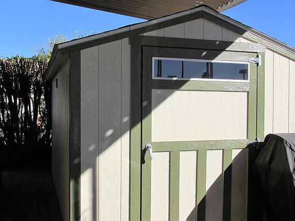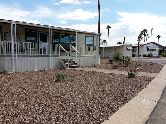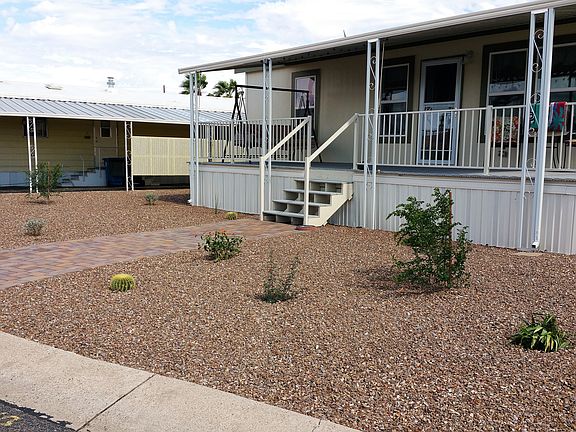 This 3 bed/2 bath double wide home is 2yrs old. Beautifully decorated all appliances are 2015 also and included. Front porch and car port and shed were also added after market. Front porch faces the Tucson Mountains for beautiful sunsets each evening. Looking out your dining room you will see the beautiful Catalina mountains for a beautiful sunrise . Master bedroom is oversized with walkin closet and bathroom includes soaking corner tub with private shower and toilet. 2 bedrooms at opposite end of home for guest or family with full bath and each with walk in closets. Addl hall storage as well. Built in china hutch in dining room. Walk in pantry in kitchen and laundry room at the back door. Full glass Anderson Screen doors were added with hide away screens. 55 plus park gated community with many amenities pool and club house directly across the street for easy access.