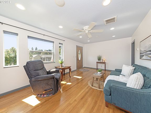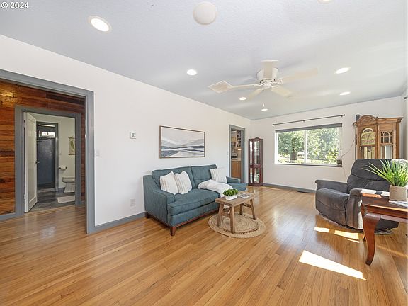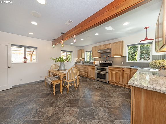 This charming, restored farmhouse, remodeled in 2018, sits on 1.8 acres of picturesque land, offering 2,011 sq. ft. of living space. The home features 3 bedrooms, 2 bathrooms, and beautiful wood floors. The spacious kitchen, complete with under-counter lighting and beautiful beamed ceilings, shares an open area with the dining room, perfect for gatherings. Throughout the hallway and up the stairs, you'll find stunning reclaimed wood, adding warmth and character to the home. Outside, the property includes two barns, one of which is dual-purpose, serving as either RV parking or a barn, and is currently rented out for $700 per month, providing added income potential. A separate studio offers space for creativity or a workshop, and the property is ideal for a hobby farm with pasture fencing already in place. The land also offers established fruit-bearing plants, including grapes, raspberries, strawberries, and four apple trees with two varieties. A detached garage completes this versatile and welcoming home. Additional items that can stay with the home include a safe, riding lawn mower, 4x6 yard trailer, as well as a spare fridge and freezer located in the barn. Internet is Ziply Fiber.