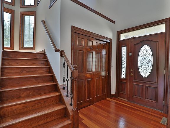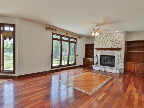Lovely home that is welcoming and warm with a quaint front porch. You'll find gorgeous woodwork throughout this 3 bedroom, 2.5 bath property with a 3 car attached garage. The main level has beautiful cherry hardwood flooring with the family and formal dining rooms having a pretty wood inlay rug design. The great room also has a stone fireplace and is flanked by built in bookcases. The wonderful kitchen has granite, great storage and an island. Convenient 1st floor laundry and 1/2 bath. Unwind in a the true master suite with pretty ceiling detail and fireplace. The master bathroom includes a jetted tub, double vanity and separate shower. The lower level is stubbed for a bathroom and ready for you to finish if desired. Sit and enjoy the the peaceful views from the patio of the open space