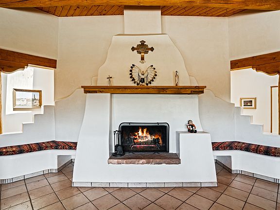 This one owner well maintained home is nestled on a quiet cul de sac street in an established neighborhood and offers an oasis of tranquility. It offers unparalleled charm and every detail has been thoughtfully crafted for luxurious living. From the moment you step into the spacious entry, you'll be captivated by the high ceilings throughout and the unique architectural elements. Enjoy the timeless Santa Fe charm vigas bring and especially when they are topped with split cedar as the grand hallway has been. Gather around the beautifully designed wood fireplace in the cozy living room, or enjoy morning coffee in the circular breakfast area with its enchanting wood-coned ceiling. The heart of the home, an updated kitchen with an island flows seamlessly into a formal dining area, perfect for entertaining. Retreat to the roomy primary bedroom or one of two spacious secondary bedrooms, each boasting an en-suite bathroom and generous closets. Outside, discover a private haven with established, irrigated front and back landscaping with a beautiful rose garden, and an enclosed backyard. Practical amenities such as an extra-long driveway, an oversized 1100 square foot 2-car garage with a 10-foot high double door. The garage is finished and has high ceilings and can accommodate many uses and greatly adds to the home's appeal. Bask in abundant natural light and enjoy the peace of mind that comes with living in an elegantly crafted home.