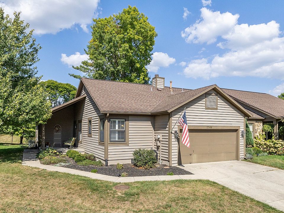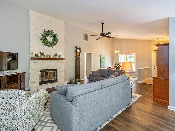 Immaculate ranch in popular Muir Woods! Updated kitchen with soft close cabinets, quartz countertops, stainless appliances and plantation shutters! Great room features vaulted ceiling, gas fireplace and doors to rear deck and is open to dining room! Primary bath has two sinks, garden tub and separate shower and tile is all in excellent condition. Updated flooring and lighting throughout. Washer and dryer remain. Pull down stairs in two car garage for extra storage. Updated blinds in 3rd bedroom/office which overlooks the deck. Kinetico water system. Radon system. One common wall. HOA maintains yard and exterior of property and handles snow removal. Unbelievable location close to schools, restaurants and shopping at Keystone at the Crossing!