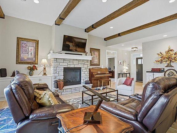 Step into the vaulted living room with wood-beamed ceilings, a striking stone fireplace, and brand-new hardwood flooring that sets the stage for timeless style. The sunroom (featuring all new windows) and patio overlook tranquil pond views, creating the perfect space to relax or entertain.