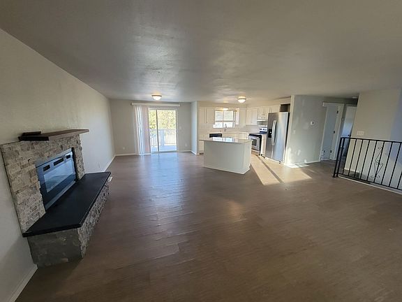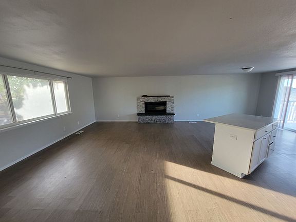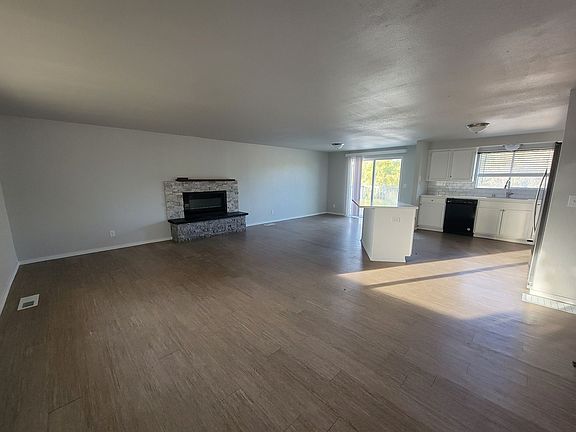 This remodeled 4-bedroom, 2-bath split-level home features updates and a functional design throughout. The main level offers an open-concept living, dining, and kitchen area with a stone-encased electric fireplace, fresh interior paint, and a kitchen complete with granite countertops, subway tile backsplash, island seating, and access to the back deck.