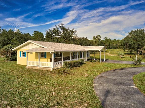 Discover the perfect blend of privacy, comfort, and outdoor living in this beautifully maintained 4-bedroom, 2-bathroom home with 1,853 sq. ft. of living space on just under 7 acres. The home features a new roof (2024), fresh exterior paint, dual-zone A/C with two units, upgraded windows, and plantation shutters throughout. Inside, you’ll find a thoughtfully designed layout with no carpet—low-maintenance flooring and abundant storage, including a large laundry room and double walk-in closets in the master suite. The primary bathroom offers a large jetted garden tub, double vanity, and separate walk-in shower for a true retreat. Outdoor living shines here, starting with a welcoming circular driveway, large front porch, mature landscaping with palms, crepe myrtles, and evergreens, plus well water—no water bill to worry about. The spacious enclosed back patio with double ceiling fans overlooks the sprawling natural acreage, perfect for enjoying morning coffee or evening sunsets. No neighbors on three sides of the property. The property sits on two fully fenced and cleared acres, secured with an automatic solar-powered double gate, plus five additional natural acres for a total of nearly 7 acres. Wildlife enthusiasts will love the deer, fox squirrels, gopher tortoises, and birds that frequent the property. A highlight is the massive 40' x 60' detached workshop/garage/RV barn with three bays and a large upstairs loft—ideal for hobbies, storage, or business needs. Located in Rainbow Lakes Estates, residents enjoy access to two lakes in the neighborhood, a fitness center, community center, playgrounds, and parks. Just 5 miles from the beautiful Rainbow River, with the Gulf of Mexico and Goethe State Forest nearby, endless outdoor recreation awaits. If you’ve been searching for room to roam, peaceful surroundings, and space for all your hobbies and toys, this property is a must-see!