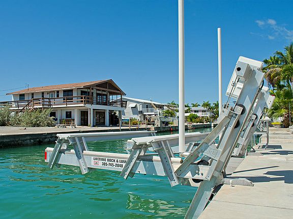 Wonderful canal front home on the ocean side of Cudjoe Key. This home is all about water sports. The 75' step down dock and seawall make easy entry for small crafts, kayaks and paddle boards while the boat lift can handle your big toy up to 5 tons. This location offers great deep water boating with quick access to the ocean and the back country. This home features 3 bedrooms and 2 full baths with vaulted ceilings, wood floors, Anderson windows and a 2 car garage with hurricane rated garage doors. All of this sits on a 7,500 sf lot with mature landscaping. New metal roof 2019.