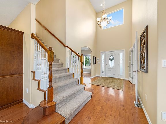 This 5 bedroom, 5 plus car garage home with city and mountian views is in the exclusive Morningside community, in CVSD. Home features include fire sprinkler system in home, main floor office w/ french doors, formal dining room, a great room with gas fireplace and gorgeous built ins, soaring ceilings, maple prefinished hardwood flooring, built-in audio speaker system through main & upper level, and large covered deck, recent updates in carpet, paint and select appliances, two high efficiency furnaces, CAT 5 wiring, water softener, 2 h/w tanks. Primary Ensuite is a dream! Nearly half acre lot backs up to cul-de-sac. Designed with space for future pool & shed-electrical conduit in. Add'l features in ground trampoline, 2 built in humidifiers, intercom, soffit outlets for lighting, wiring for future deck fan in place, gas stub on deck, laundry chute, unfinished room in basement wired for home theater, central vac, main floor laundry room, hot tub, side roll up garage door. SEE VIRTUAL TOUR