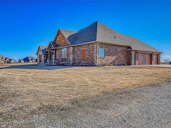 This home is a 2017 Jason Pruitt custom home. It has 4 bedrooms, 3 bathrooms. Two bedrooms and bath on one end and two bedrooms and two baths and a utility room on the other end. The washer and dryer stay. Open plan kitchen, dining and living room with a wood-burning fireplace with a fan for heat circulation. The kitchen has soft close drawers and doors. All the appliances are stainless steel and they will remain with the property. The kitchen, dining and living area can be closed off with barn doors to conserve heat if the electricity goes off. Plumbed for a water softener and wired for generator. Triple car garage with storm shelter in the floor. Also a spacious covered patio all on 1 and 3/4 acres.