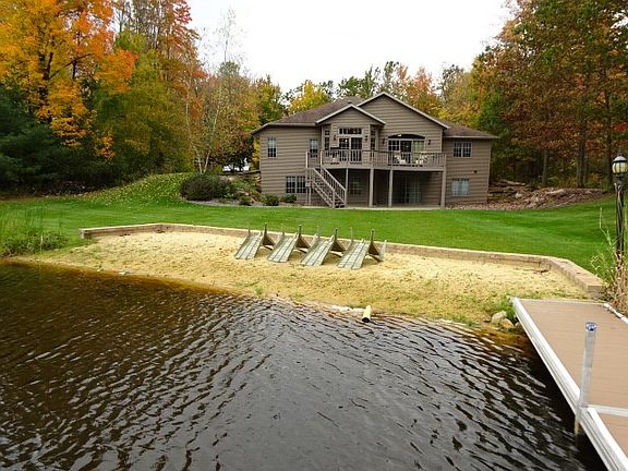Water frontage on Eagle Summit Lake. Exceptional design and attention to detail. Wonderful 5 bedroom home featuring oak raised panel doors, white kitchen cabinetry, maple wood floors in formal dining, kitchen and dining area. Vaulted ceiling & gas fireplace in great room complete with patio door access to large backyard deck which overlooks the Lake. All rooms facing the water have large windows in them.Master suite offers dual sink vanity and whirlpool tub & walk-in shower. Your family can enjoy the lower level family room with second fireplace, 2 large bedrooms, (again large windows overlooking the water) and full bath. Granite counter tops and newer kitchen appliances. New 2015 High efficiency furnace, central air & carpeting. Underground sprinkler system is installed in front and back of home. Enjoy canoeing, swimming and spending time in the water, dock is included. Eagle Summit Lake is a private 28ft deep lake stocked with game fish. Pond is a licensed fishery which allows you to fish all year long. New sand beach area for enjoying the sun. Lake association fee is $25/year.