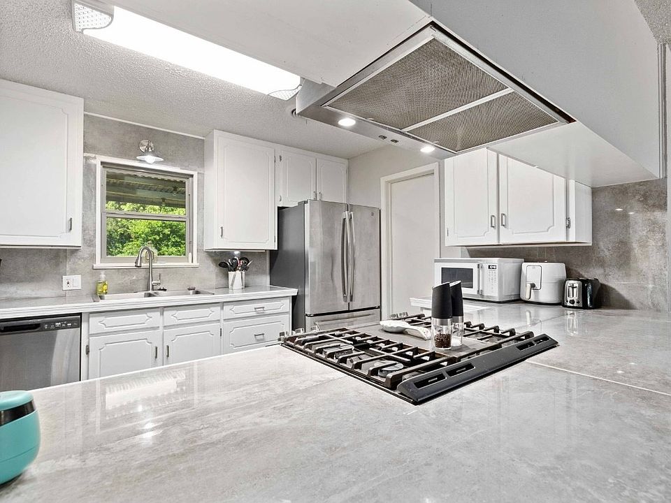 Stainless steel appliancesNewer flooringStorage buildingLarge dining areaFenced backyardGas rangeTiled shower