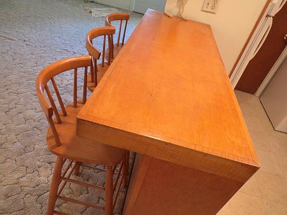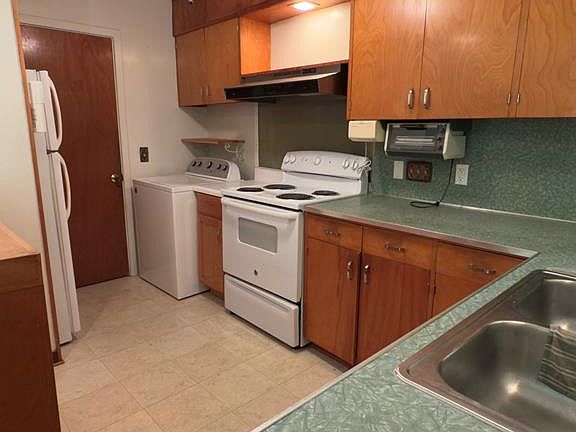Fenced in backyardLarge windowsRetro galley kitchenCustom real wood cabinetsAntique countertopsLaundry area