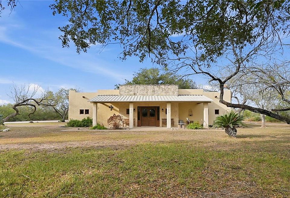 Custom-built Santa Fe–inspired home (2001) on 5 acres in Live Oak County. 2,146 sq ft, 3 bedrooms, 2 full baths, split-bedroom layout. Solar-powered gated entry, producing olive grove, and mature native trees.