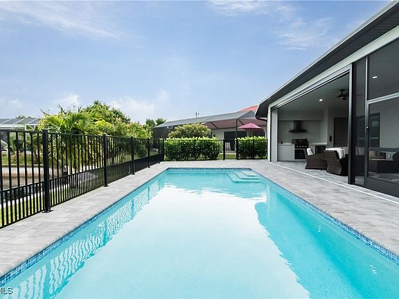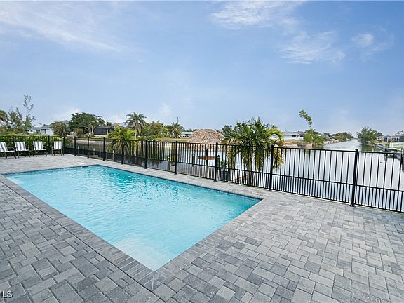 This exceptional Waterfront FURNSIHED optional home in Cape Coral, offering almost 2,300 square feet of beautifully designed living space with a comprehensive CAMERA security system for peace of mind. Featuring 3 bedrooms plus a den, 2 full bathrooms, with city water and sewer this home is ideal for those seeking both comfort and location. Just off Veterans and Chiquita, with eastern exposure, you'll enjoy sunrises over the canal right from your backyard. As you enter through the double doors, you're immediately captivated by soaring 13-foot ceilings in the living room, flooding the space with natural light and creating an inviting atmosphere perfect for relaxation and entertaining. Impact windows and six-door sliders frame stunning, unobstructed views of the canal, effortlessly blending indoor and outdoor living. The chef’s kitchen is a standout, featuring sleek quartz countertops, soft-close drawers and cabinets for both style and functionality. Your waterfront view is integrated with a dock, featuring a palm frond umbrella for shade. Outdoors, the fully equipped kitchen makes outdoor dining a breeze, while the automatic screen system quickly opens the lanai to the outdoors, allowing you to enjoy the serene surroundings in seconds. The master suite is a private retreat, complete with a carwash-style shower, a soaking tub for ultimate relaxation, and private sliders leading directly to the back lanai for easy access to the pool and waterfront views. Additional highlights include a resort-style pool with a convenient pool bath, a captain’s walk dock with a tiki hut, and a three-car garage with epoxy flooring for all your vehicles and storage needs. With pavers surrounding the home and no flood insurance required, this property offers peace of mind and significant savings. Move-in ready, this home is the ultimate Florida retreat, blending modern luxury with a prime waterfront location.