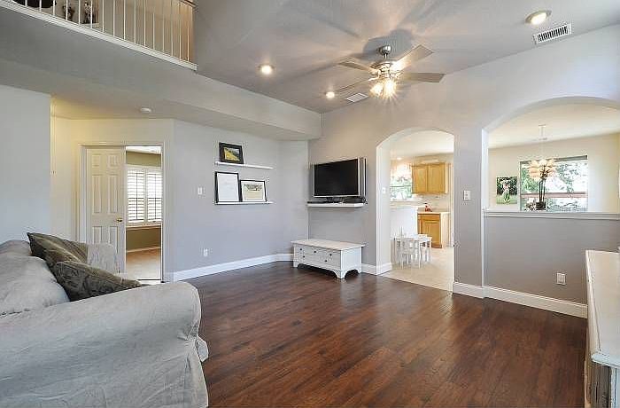Large corner lot with large trees, plantation shutters, 3 baths, office or 4th bedroom down, high ceilings, beautiful hardwood floors in living room , covered patio and more! Neighborhood Description This is a great, safe, family friendly neighborhood. Our home has a wonderful grassy area in the back and the neighborhood also has a swimming pool