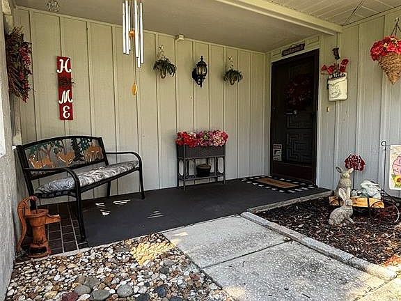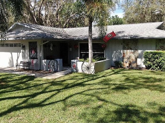 Presenting a stunning home now available in the desirable Woodbend Subdivision. Residents of this community often put down roots, creating a lasting sense of belonging. This forever home is situated on 0.55 acres of land, securely positioned in a non-flood zone. As you enter through the generous driveway, offering ample parking, you are welcomed by a charming front porch, perfect for enjoying tranquil mornings or relaxing evenings. Stepping inside, you are greeted by a warm and inviting ambiance. The living room features hardwood flooring, providing plenty of space for comfort and entertaining, complemented by a striking double-sided fireplace that adds a unique flair. Each bedroom is equipped with its own walk-in closet and private bathroom, showcasing oversized vanities and custom countertops. The master bathroom offers dual access, with entries from both the master suite and the hallway. The farmhouse-style kitchen boasts granite countertops and includes appliances, along with an island/breakfast bar ideal for casual dining and entertaining. The adjoining dining room provides additional space and seating, all while enjoying the view of the double-sided fireplace. A pantry is available for storing non-perishable items, and the two-car garage features a convenient entrance that leads to a laundry/mudroom. From the living room or dining area, sliding doors provide access to a delightful Floridian back porch, creating an ideal space for relaxation or hosting gatherings. The back porch opens to your personal oasis, where you can immerse yourself in nature, cultivate a garden, or grill under the gazebo, surrounded by an array of pineapple bushes and banana trees, offering the joy of homegrown organic fruits. The backyard includes three sheds: a 17'x22' workshop with electrical access (110–220 volts, lighting, and concrete floor), a 12'x22' storage/shop (electric 110v, lighting, concrete, and safety flooring), and a 10'x10' lawn equipment storage shed (electric 110v, one light). The property is equipped with a well pump sprinkler system featuring ten zones and is enclosed by a fence with two access vinyl fence gates. Recent updates include a full roof replacement completed on January 21, 2020; popcorn ceiling removal on September 16, 2020; a new HVAC system installed on April 15, 2021; new windows added in February 2022; a new water heater on August 27, 2023; septic tank servicing on February 7, 2025; and a four-point inspection conducted on June 23, 2025. Woodbend Subdivision is a no outlet community with only one entrance and exit, ensuring minimal through traffic and a peaceful atmosphere. Conveniently located near Seven Springs and Trinity, you enjoy easy access to essential amenities while maintaining a sense of spaciousness without overcrowding. Woodbend Subdivision HOA is Voluntary. Schedule your showing today!