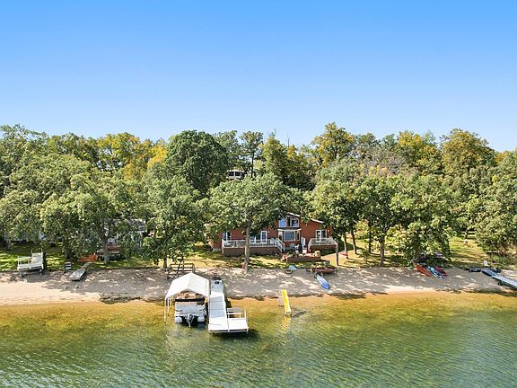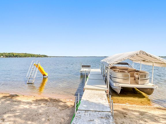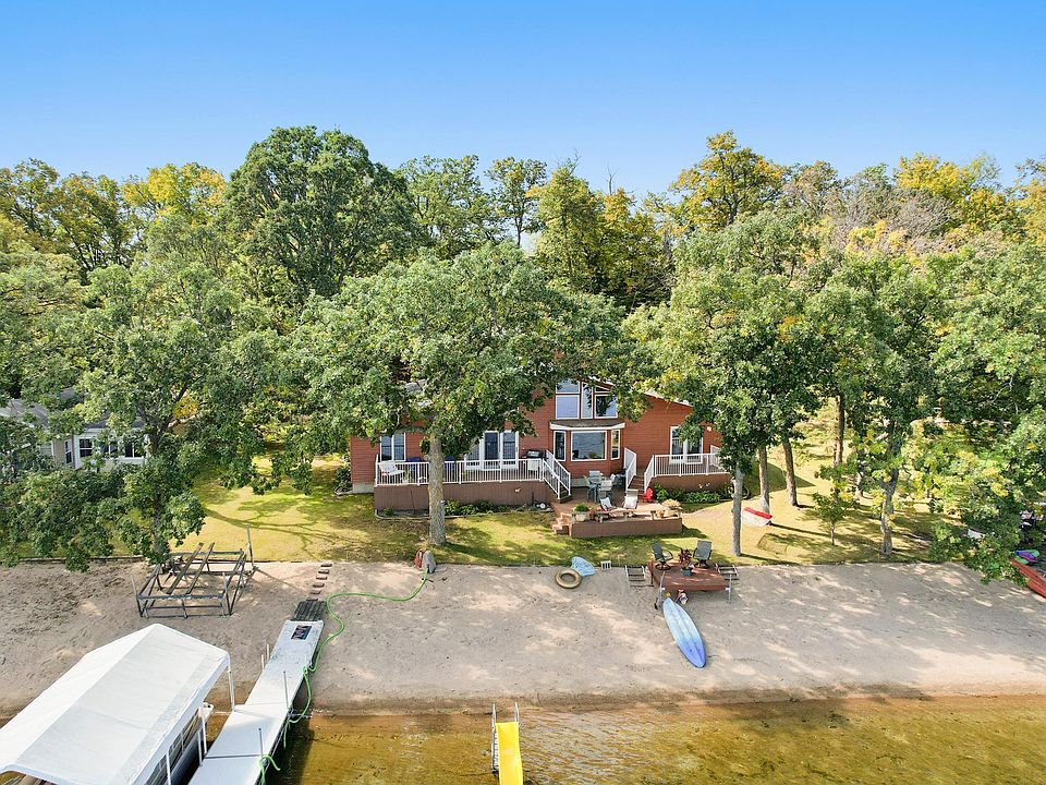 Lake Melissa - Year Round. 98’ of fabulous sugar sand beach is host to this well built 4BD/3BA lake home; a lake home that checks all of the boxes when it comes to ideal function in lake living. Vaulted living room with fireplace & major windows to the lake, kitchen/dining that flow seamlessly to lakeside outdoor living spaces and extensive decking, huge primary suite that also walks out to its own lakeside deck. Opposite wing - guest bedrooms and bath. Upper level is additional guest/office space, and a huge guest suite above the garage with both attached and separate entry access & a small deck road side for the ultimate private outdoor getaway spot. Main floor laundry, attached garage, quiet neighborhood, dead-end road, small garden shed. South shore lends all day sun. Dock system included.