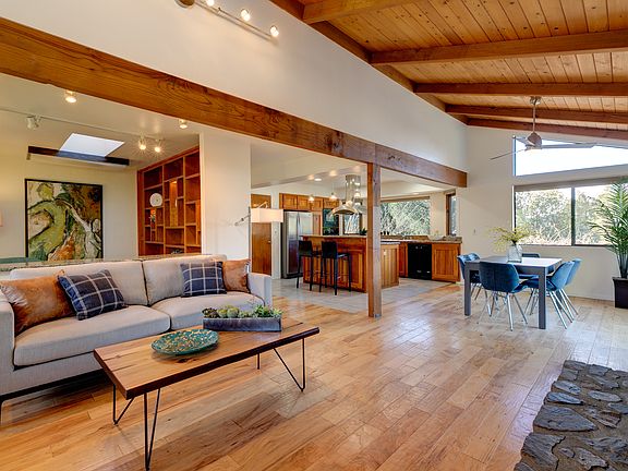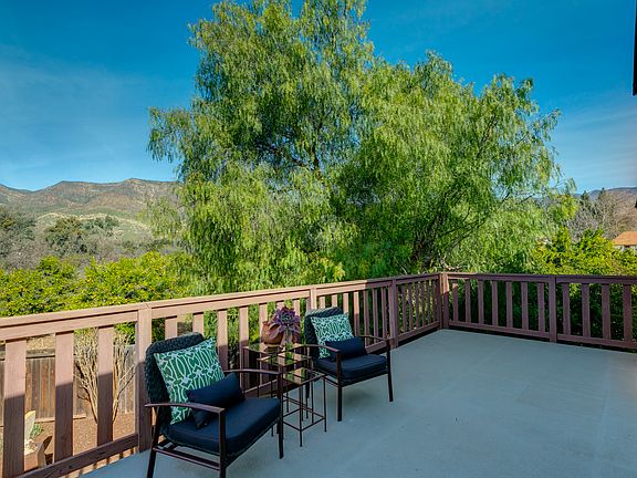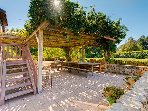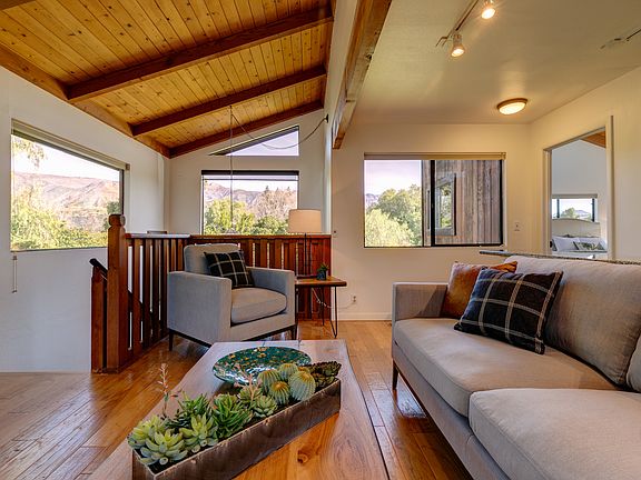 This rustic contemporary home boasts 360 degree views. The fantastic 2 acre lot sits on a cul de sac in Ojai's desirable East End. The open concept kitchen and living room are enhanced by vaulted ceilings, a massive stone fireplace, and mountain views. The back yard is perfectly suited to take advantage of Ojai's Mediterranean climate. Enjoy your morning coffee or dine al fresco under the wisteria covered pergola. The mature family orchard features plum, persimmon, peach, Fuji apple, pixie tangerine, orange, and lemon trees, along with grape vines. The efficient solar system offers substantial savings on electric bills. Open air studio/workshop. Property backs up to equestrian trail and golf course and is just a short distance from Soule Park. Zoning will permit building of a guest house.