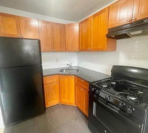 Hardwood Flooring, Full sized black appliances (Fridge and Stove), on site super.
