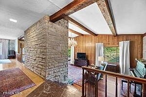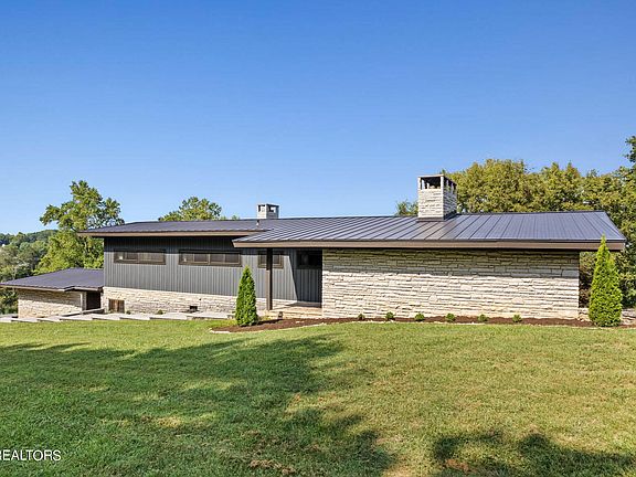 Welcome to 231 Cumberland View Rd in Clinton! This stunning single-family property is a true gem that offers a serene and picturesque lifestyle. Boasting 4 bedrooms and 3 full bathrooms with an attached two car carport. Situated on a sprawling 16.95-acre lot, this property offers breathtaking views of the mountains and surrounding farmland. Nature lovers will delight in the mature tree-dotted landscape, where deer play and fireflies illuminate the summer nights. The peonies bloom annually, adding a burst of color, while the abundance of blackberries is perfect for indulging in homemade cobblers. The property also features bearing chestnut trees, which bring Christmas cheer to last a lifetime. As you enter the home, you'll be greeted by the warmth of hand-hewn wood beams in the living room, kitchen, and downstairs den. The rich woodwork, including black walnut, maple, and cherry accents, adds a touch of timeless elegance to the space. The main level features 3 bedrooms & 2 bathrooms, including the primary bedroom with his and her closets. The living room boasts a stone and marble, floor to ceiling fireplace, hardwood floors, and wood beam ceilings. Continue your entertaining out the door to the covered patio. Incredible views continue in the formal dining room & eat-in kitchen. Kitchen offers tons of storage, wood burning stove, baker's pantry, and newly updated Quartz countertops & subway tile backsplash. Lower level could be another living space as it features the 4th bedroom, updated bathroom, laundry, large bonus room with fireplace, entertainment room with a cherry and wormy chestnut bar. Walkout access to backyard and fire pit. Can't forget the Terrazzo floors! In addition to the natural beauty of the surroundings, there are plenty of amenities nearby. Conveniently located, this home provides easy access to Oak Ridge and Clinton, ensuring that you'll have everything you need just a short drive away.