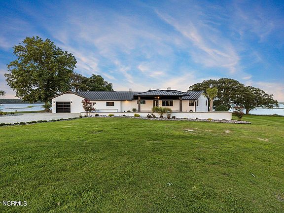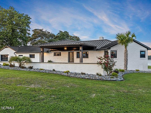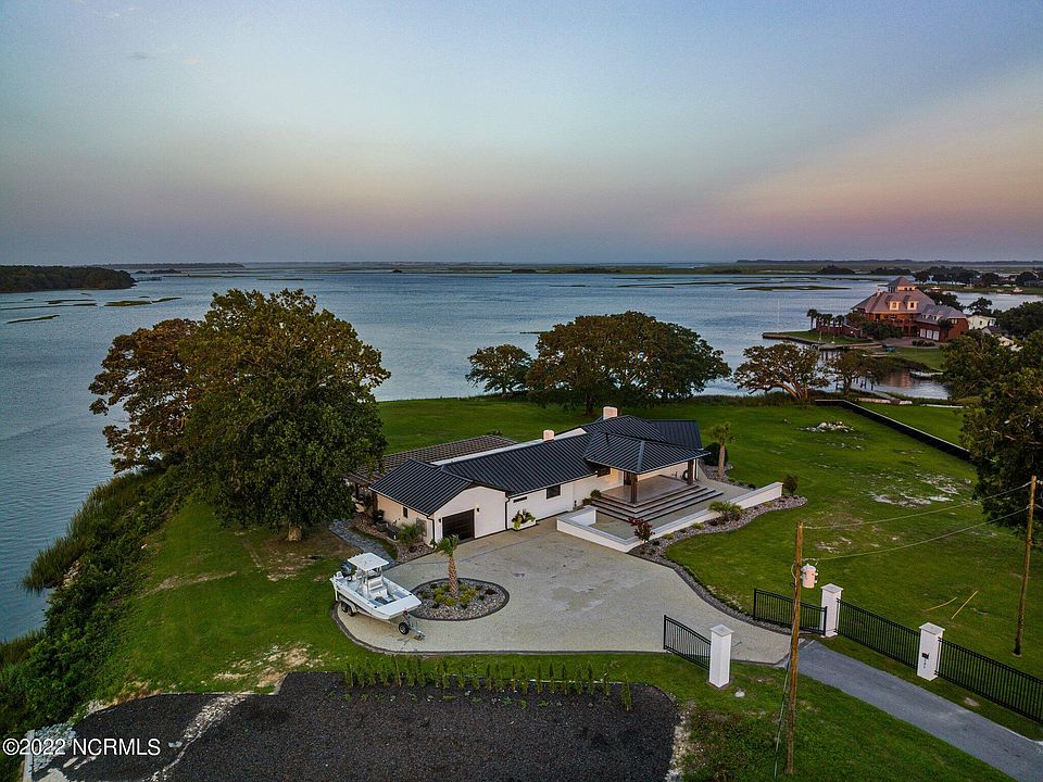 HUGE 100k REDDUCTION! Stunning deep waterfront home is now offered . Seller is negotiable with fair offers combined with the additional waterfront lot with a 4 bedroom septic! The ranch and split floor plan home features 4 bedrooms and 4 baths is a crown jewel of waterfront properties. The home sits on a high bluff over looking the ICWW, Bogue Inlet, and Hammocks Beach State park with panoramic views that rivals any NC waterfront in the area ! Over an acre and half with majestic live oak trees on high bluff with an elevation that requires no flood insurance . From the moment you walk into the front door you are immediately immersed in the best North Carolina coastal lifestyle of open living. The light paint and tile flooring with exquisite finishes throughout the home with a terraced patio , outdoor living overlooking infinite views with new concrete dock and boat lift . A gorgeous home for entertaining family and guests from indoors to outdoors with impact glass telescoping doors and huge plate impact windows that are protected with pull down storm shutters . An elegant gourmet kitchen is open to many casual dining options while continuing to harmoniously highlight the water views. The chefs dream kitchen offers Italian appliances, gas range, instant pot filler, island with beverage station, plenty of marble counter work space, and generous amount of storage cabinets. The rejuvenation continues with a new metal roof and all bathrooms have premium tile with fixtures featuring rain showers and other options . The huge master suite has a wood fireplace, coffered ceilings, exquisite bath with soaking tub, double vanity, touch mirror controls, walk in shower and laundry facility with sink cabinets and racks. Electric gated entry that is lighted . The outdoor living features an ambiance of spaces with kitchen and fireplace, multiple sitting areas with TV and fire pit. For the discerning buyer , this is a must see . The special feature list is in document