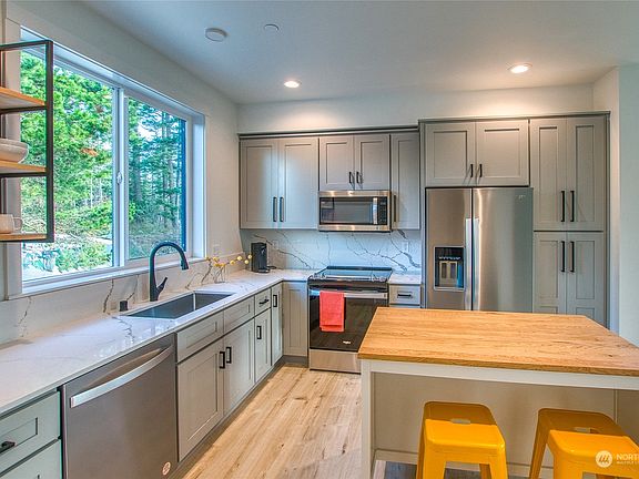 Vacation rental investment in Eastsound Village Townhomes! Newly constructed 3 bed/3.5 bath, located near schools, library, beaches, and all local amenities. This five-unit complex offers 2 private entrances for each home. Positioned on the east end, this unit overlooks the village and water views of East Sound. Modern design features include wood siding, quartz and butcher block counters, stainless appliances, and crisp, white walls. The main floor can function as a locked off studio with a 3/4 bath. The second floor has an open-concept living/dining/kitchen area with a 1/2 bath. The upper level includes 2 bedrooms, each with ensuite 3/4 baths. One assigned parking space plus ample street parking. Other units sold separately.
