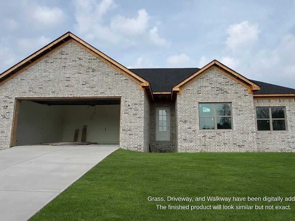 Discover this stunning new construction home offering serene views of the neighborhood pond right from the backyard. The thoughtful floor plan features a split-bedroom design that provides privacy and comfort for both the primary suite and guest rooms. The gorgeous kitchen stands out with its large island and generous workspace, making it perfect for everyday living and entertaining. In the living room, a floor-to-ceiling brick fireplace creates a warm and inviting focal point. The primary suite includes a spacious bathroom with a large walk-in closet and ample storage throughout. Enjoy relaxing evenings on the covered patio with beautiful tongue-and-groove ceilings that add an elevated touch. This home combines style, functionality, and craftsmanship in every detail.