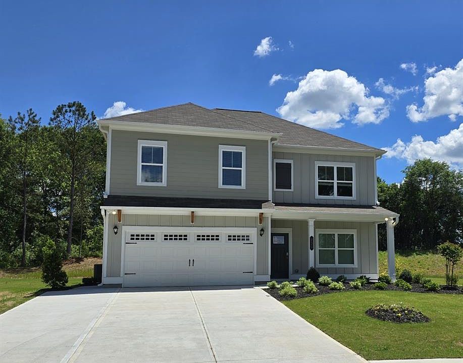 Move in Ready! The McGinnis plan located in Smith Douglas Homes new community, Morgan Landing! Morgan Landing is in a top ranking school district and close to great shopping and dining, less than 3.5 miles to downtown Carrollton and only 6.5 miles to to the University of West GA!!!!! Stunning lake view with a large wooded backyard, you will not want to miss this! This former model home offers a welcoming wide entry foyer open to a formal dining area with chair railing and shadow box trim. Follow the foyer to the kitchen with its center island with granite counters, upgraded cabinets, stainless steel appliances (including the refrigerator), walk-in corner pantry,and breakfast area all overlooking the fireside family room. Access the yard from the kitchen, where you will enjoy outdoor entertaining from the covered patio. The main floor has upgraded Vinyl plank flooring throughout and window blinds have been included. The upstairs offers an open loft area, three secondary bedrooms each with a walk-in closet and large secondary bath. The spacious Primary Suite features a large walk-in closet while the Owner's bath has dual sinks, separate Garden tub with picture window and shower. A convenient laundry room with the washer and dryer included! Both stories have 9ft ceiling heights. Photos are representative of plan not of actual home being built. Ask about seller incentives with use of preferred lenders. Self touring is available.