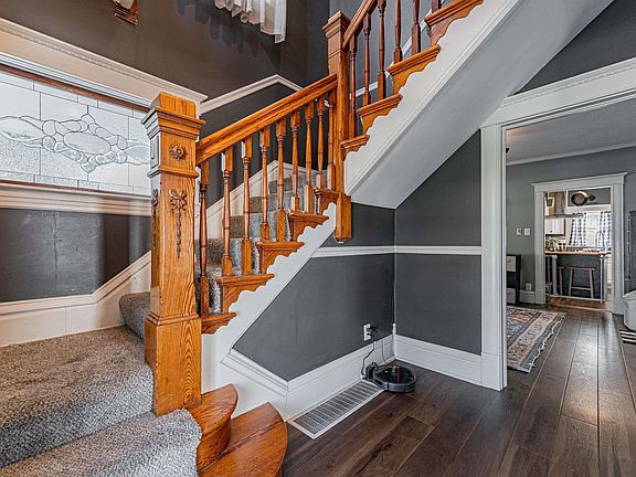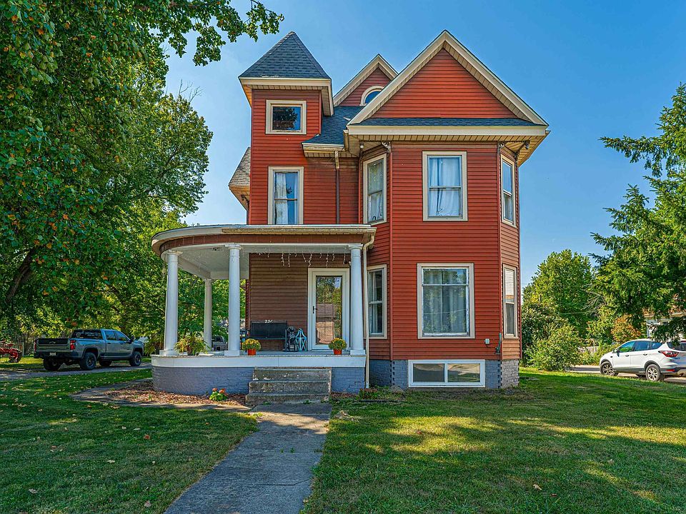 Beautiful 3-bedroom, 2.5 bath aluminum sided two-story Queen Anne Victorian style home in Maroa offering all of the charm of yesteryear paired with the desired updates for today's times! Main floor of home boasts an inviting foyer host to a charming open staircase, gracious bright and airy living, family, and dining areas with ample natural light as well as great floor space, updated equipped kitchen with a center island/breakfast bar and adjacent mudroom area, and an updated half bath. Upstairs, you will find a fabulous 13X19 primary suite that features an extra-large walk-in closet in addition to a stunning private tiled bath, two additional bedrooms (one with a rear staircase), and a full hall bath. The full partially finished basement offers a 22X24 finished rec room with adjacent laundry facilities, mechanicals, and great storage/work space. Property also features a covered front wrap around porch, rear patio area, architectural roof, fenced backyard, classic interior pocket doors, stained glass windows, walk-up attic, two furnaces/two central air conditioning units, and a concrete block constructed 4+ car detached garage with an overhead loft. Charm and comfort await you and yours with this small town beauty!
