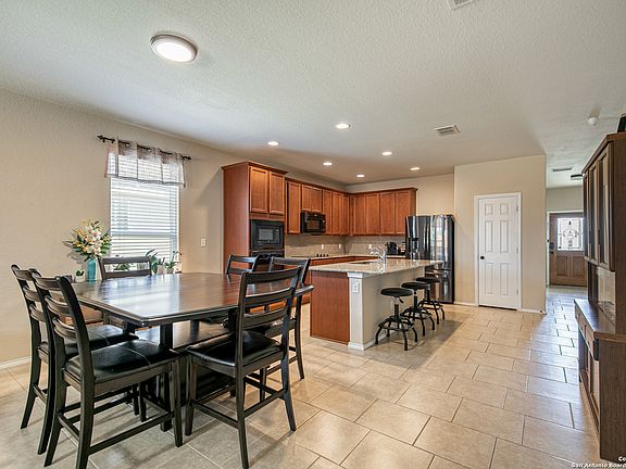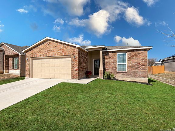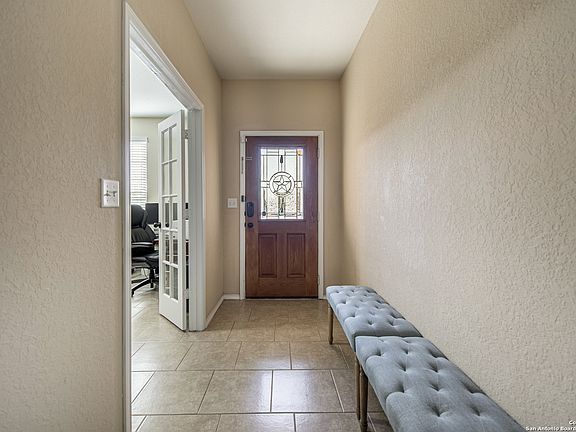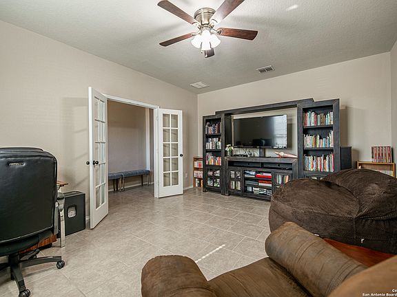 Immaculately maintained single story home at the Kensington Ranch subdivision in Selma, TX - sitting across from a cul-de-sac, and backing up to an easement. This open floor plan offers 1,881 sqft with 3 Bedrooms, 2 Bathrooms, PLUS a Study w/ glass French doors! Gourmet kitchen with granite countertops, built-in oven & microwave, smooth cooktop, and an amazing oversized kitchen island. Primary Suite features a walk-in closet w/ custom shelving, and Primary Bath with dual vanity and separate garden tub & shower. Enjoy the beautifully landscaped backyard, and covered patio updated with wood rails & tile flooring - perfect for relaxing, or entertaining! Garage walls and ceiling have been painted & textured, with floating shelves for storage and a ceiling fan to keep cool in the summer! MANY recent improvements - including new garage door opener (2021), keyless entry (2022), whole house surge protector (2022), and so much more! Community park & playground just a short walk from your front door. Easy access to IH-35; Conveniently located near dining, shopping, entertainment, and Randolph AFB. * Water softener, security cameras, all window coverings (blinds, curtains, & rods) convey.
