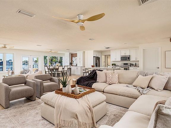 Welcome to an exceptional, fully renovated waterfront home on the private island of Vina del Mar—one of St. Pete Beach’s most desirable boating communities. South of the iconic Don Ce Sar Resort, this island offers exclusive access through Historic Pass-a-Grille. Each return home drive across the Bayway Bridge feels like you are on vacation in paradise with sweeping views of the Pink Palace and miles of white-sand shoreline. Every night you can relax by the pool with a glass of wine and enjoy a spectacular sunset. For avid boaters, this location is unmatched: enjoy a protected open harbor, no fixed bridges, and a short ride to the Gulf of Mexico for sunset cruises, fishing, and day trips to pristine islands. Lower the lift and you’re on the water within minutes. This solid block three-bedroom, two-bath home offers over 2,100 sq ft of beautifully designed living space, fully renovated in 2025 under the direction of an award-winning interior designer. The moment you enter, the open floor plan and stunning waterfront view create an immediate “wow” effect. The layout flows from the custom kitchen through the dining and family rooms to a wall of glass overlooking the outdoor oasis. Large interior living spaces easily host intimate gatherings or lively celebrations. The chef’s kitchen features white shaker cabinetry, generous drawer storage, premium stainless steel appliances including a KitchenAid double oven/convection range and microwave. The expansive quartz countertops offer an oversized breakfast bar ideal for entertaining. The split bedroom plan provides privacy, with a spacious waterfront primary suite large enough for a seating area or office. The spacious primary bedroom includes a waterfront seating area, Luxurious bath with a dual-sink vanity, walk-in custom shower, and a beautifully finished custom walk-in closet. Two guest bedrooms, one of which is waterfront, share an updated, spacious, well-appointed bath. The outdoor living area captures the essence of island life. Enjoy a travertine deck, refreshing lap pool, private dock with boatlift, and tropical landscaping supported by an automated irrigation system. Walk, bike, or travel by golf cart just minutes to Historic Pass-a-Grille Beach for spectacular evening sunsets! During the day, tour it’s relaxed coastal atmosphere, charming alleys, and historic beachfront homes. Explore boutiques, galleries, and restaurants along 8th Avenue, or enjoy camaraderie at the nearby St. Petersburg Yacht Club on Don Ce Sar Club. Upgrades include energy-efficient recessed LED lighting, a tankless water heater, and a new HVAC heat-pump system. Vina del Mar Park—just blocks away—enhances the active coastal lifestyle with two dog parks, tennis and pickleball courts, basketball, a playground, and a picnic pavilion. Travel is effortless with quick interstate access and Tampa International Airport approximately 35 minutes away. Downtown St. Petersburg is a short drive for fine dining, museums, The Pier and waterfront parks with activities every weekend. Sarasota’s Ringling Museum and St. Armands Circle are a beautiful drive away over the Sunshine Skyway bridge. This exceptional property offers modern luxury, island tranquility, spectacular sunsets and premier boating access in one of St. Pete Beach’s most coveted neighborhoods—your perfect piece of paradise.